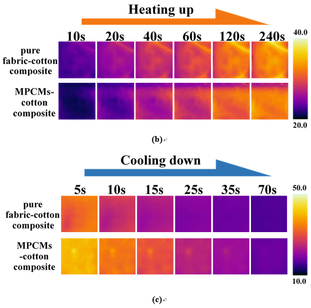 图4织物样品的红外热成像:(a) 纯面料、无MPCMs仅含整理液的面料、智能调温面料的加热过程比较;(b)纯面料+棉花、智能调温面料+棉花的加热过程比较;(c) 纯面料+棉花、智能调温面料+棉花的冷却过程比较