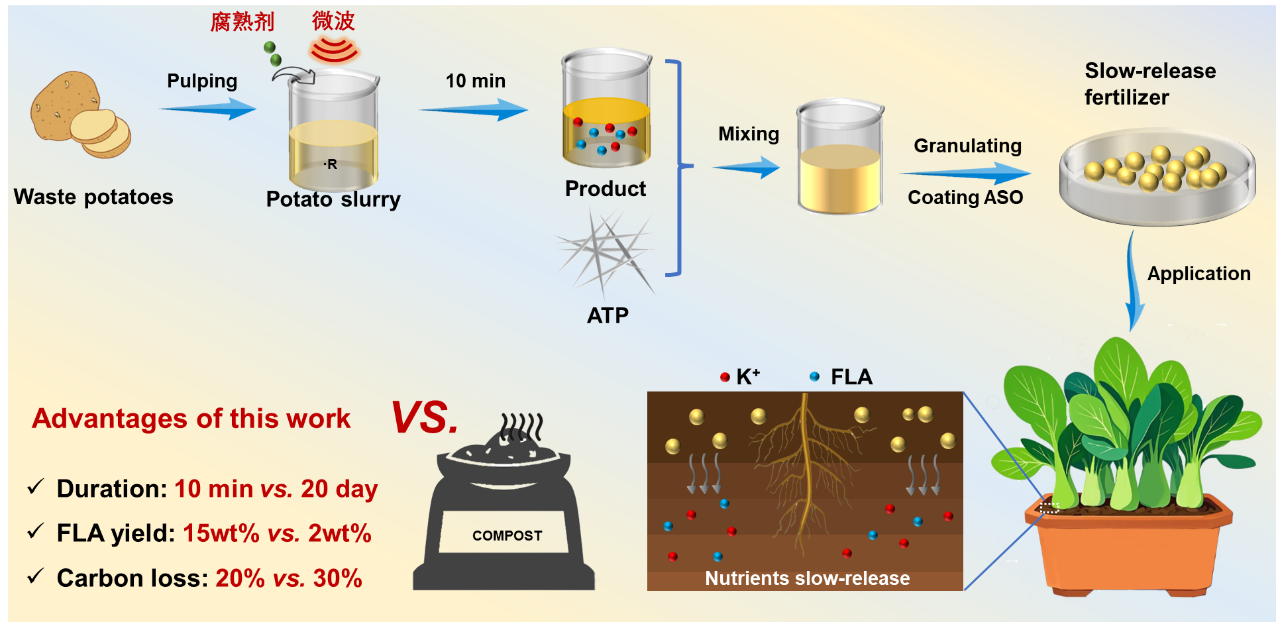 东华大学环境科学与工程学院蔡冬清研究员团队在餐厨垃圾快速腐熟领域取得重要研究进展,相关成果发表于国际期刊《自然•通讯》(Nature Communications, 2026, https://doi.org/10.1038/s41467-026-68295-6)。东华大学朱延平副教授为论文第一作者,东华大学为第一通讯单位。研究团队在原创的有机固废1小时腐熟技术(一代技术)基础上,研发出微波强化餐厨垃圾分钟级腐熟技术,其关键在于:利用微波强化促产自由基,诱导餐厨垃圾中的多糖、蛋白质等易腐有机物发生降解-聚合反应,在10分钟内转化成高活性类黄腐酸,并可进一步制成黄腐酸钾型纳米缓释肥。重要的是,该工艺较第一代技术腐熟剂用量可节省75%,成本降低50%,效率提高6倍。盆栽和田间试验表明,该肥料可显著促进植物生长和根系发育,同步改良土壤微生态。与传统的餐厨垃圾堆肥相比,该技术兼具成本低、肥效高和碳排低等优势,为餐厨垃圾高效肥料化提供了有效新质生产力。
